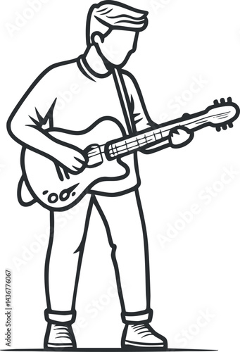 Outline illustration of a man standing and playing an electric guitar during a music performance or practice session