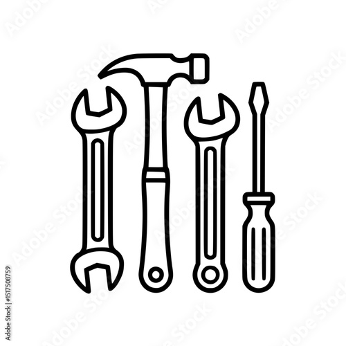 Outline illustration set of hand tools including wrench, hammer, and screwdriver