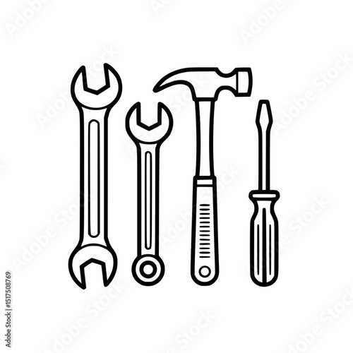 Outline illustration set of hand tools including wrench, hammer, and screwdriver