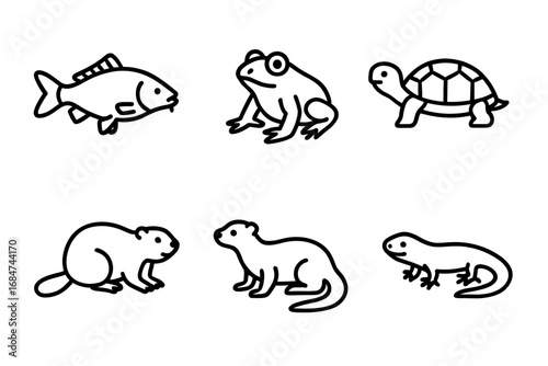 Outline illustrations of fish, frog, turtle, beaver, otter, and salamander