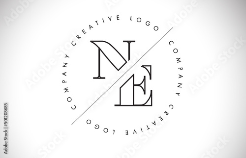 Outline NE n e letter logo with cut and intersected design and round frame.