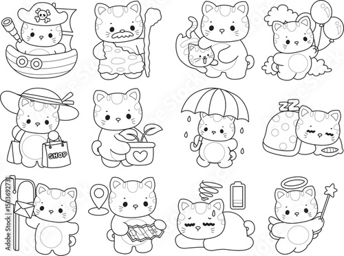 Outline of a bunch of cute cat with various activities. Lineart of Kawaii animal kitty for scrapbook and sticker.