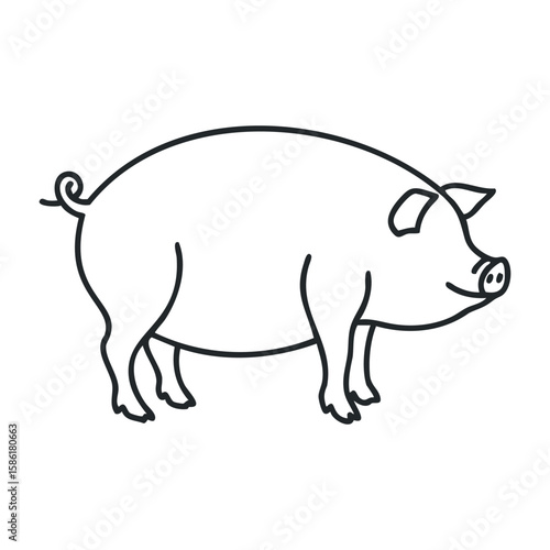 Outline of a smiling pig with curly tail on white background. Outline vector illustration