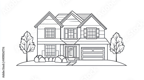 Outline of a two-story house with landscaping, ideal for real estate or architectural presentation