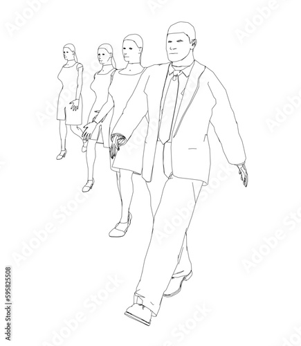 Outline of walking people in a row of black lines isolated on a white background. A man and three women. Vector illustration.