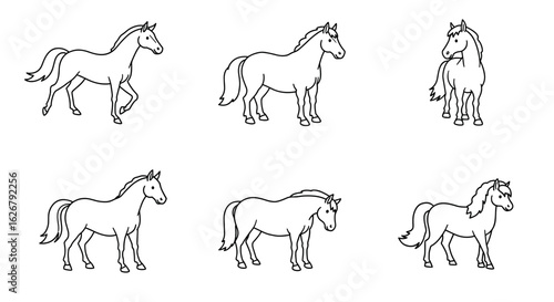Outline set of 6 icons, black on white, doodle, different horse positions