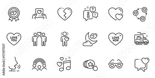 Outline set of Broken heart, Love you and Love glasses line icons for web application. Talk, information, delivery truck outline icon. Include Hold heart, Inclusion, Hearts icons. Vector
