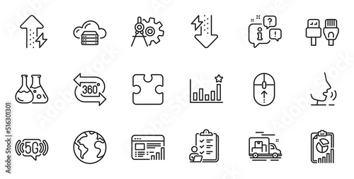 Outline set of Cogwheel dividers, Chemistry lab and Swipe up line icons for web application. Talk, information, delivery truck outline icon. Include Report, 360 degree, Efficacy icons. Vector