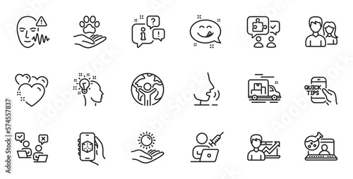 Outline set of Couple, Idea and 3d app line icons for web application. Talk, information, delivery truck outline icon. Include Sun protection, Puzzle, Success business icons. Vector