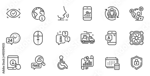 Outline set of Report document, Scroll down and Teamwork line icons for web application. Talk, information, delivery truck outline icon. Include Internet, Disability, Swipe up icons. Vector