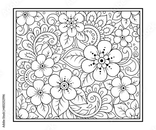 Outline square flower pattern in mehndi style for coloring book page. Antistress for adults and children. Doodle ornament in black and white. Hand draw vector illustration.