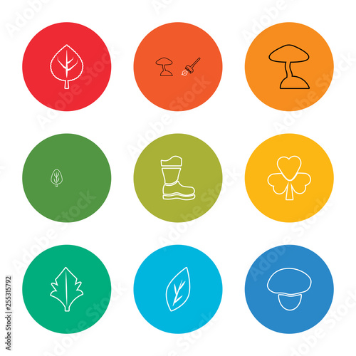 outline stroke mushroom, leaf, leaf, leaf, rubber roots, mushroom, lander, space capsule, vector line icons set on rounded colorful shapes
