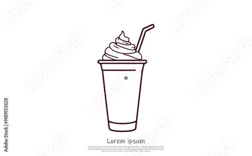Outline Style Coffee Cup with Whipped Cream and Straw Isolated on Transparent Background
