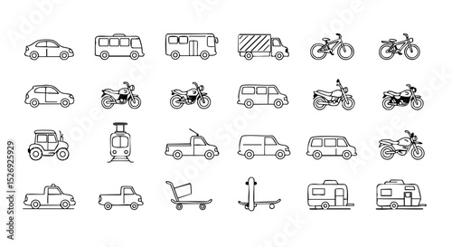 Outline Transport Icons with Car, Bus, Bike, Train, Scooter