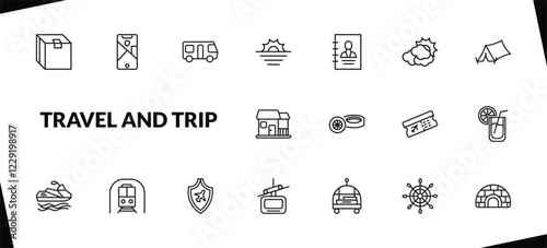 outline travel and trip icons set. editable linear mobile map, motorhome, sun, and other 15 icons in this category isolated on transparent background.