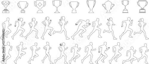 Outline trophy icons and running silhouettes in motion create a dynamic sports illustration. Perfect for athletic themes, marathon events, fitness promotions, and competition related designs