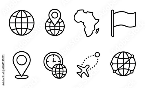 outline vector icons of global location concepts: globe, world pin, continents, country flag, international marker, time zone, flight path, world network. No text. The icons should be clean. isolated