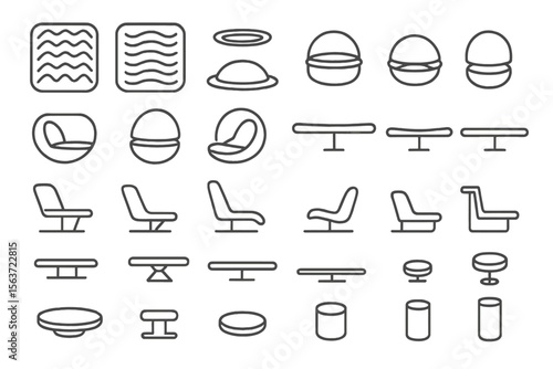 Outline vector icons of modern chairs, tables, and decor elements