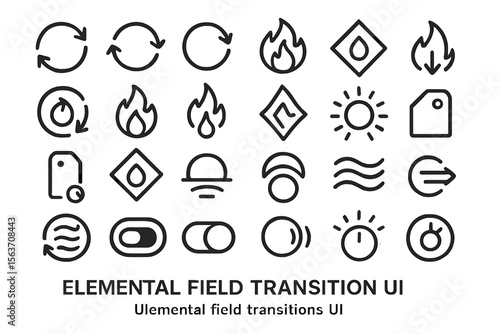 Outlined elemental UI icon set featuring fire, water, light, and motion