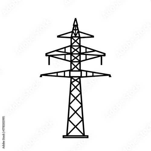 Outlined Icon Style A black outline vector icon of a power pylon, symmetrical and clean, with a triangular top, cross-braced tower, and arms extending for cables. Simple and modern, designed for logo