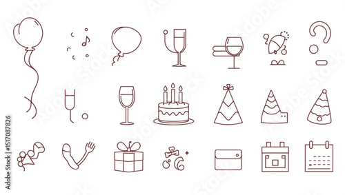 Outlined party icons including balloons champagne cake hats and a calendar in a simple line drawing created with generated ai