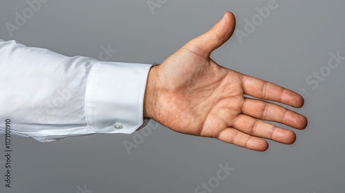Outstretched hand offering a handshake, symbolizing greeting or agreement against a neutral background.