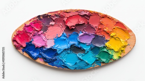 Oval wooden palette with vibrant oil paint colors.