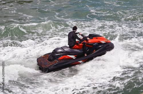 Over head view of a jet skier riding waves on a red jet ski on the Florida Intra-coastal Waterway near Miami Beach.