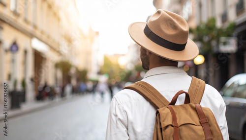 Over shoulder view of a man traveling alone against a blurry city street backdrop.