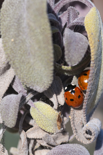 Over wintering 7 spotted ladybirds (Coccinella 7-punctata) in a sage plant