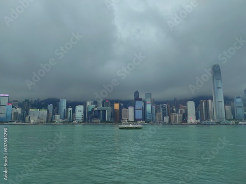 Overcast weather in the afternoon in Victoria harbour, Hong Kong. View from Avenue of Stars, Tsim Sha Tsui.