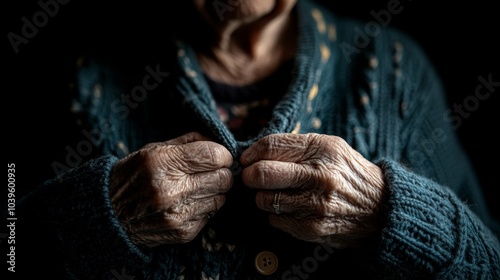 Overcoming obstacles, A Parkinson's patient's daily struggle:Close-up of trembling hands of a Parkinson's patient,Elderly man struggling with buttoning shirt due to Parkinson's disease