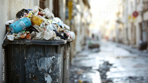Overflowing garbage bin on a street, highlighting urban waste management issues.