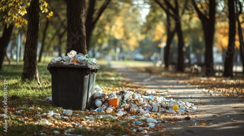 Overflowing Trash Bin Surrounded by Autumn Nature, Highlighting Urban Waste Management Challenges and Environmental Concerns on a Scenic Park Path