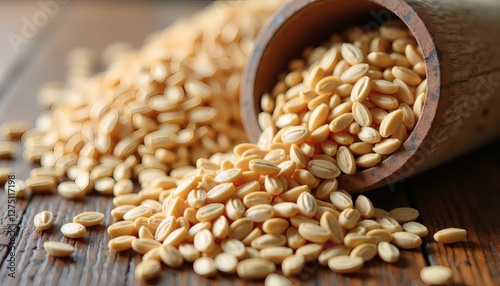 Overflowing Wooden Bowl of Pale Yellow Barley Grains Close-up