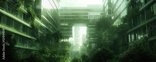 Overgrown city buildings, futuristic alley, nature reclaiming urban space, distant skyscrapers, environmental concept