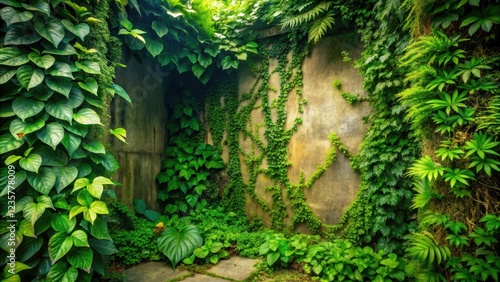 Overgrown corner with lush green foliage and vines, plant life, overgrowth, plant life, overgrowth, outdoors