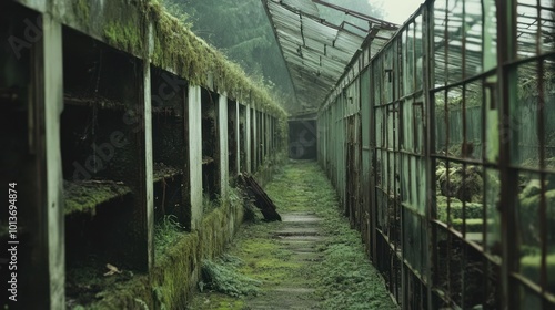Overgrown Greenhouse Pathway Leading to Dark Interior