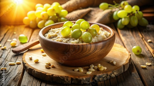 Overhead aerial shot: a vibrant bowl of oatmeal, plump grapes, healthy and delicious breakfast.