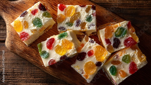 Overhead flat lay of cassata slices with candied fruit, rustic wooden board, copy space