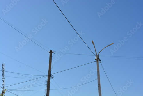 Overhead power line support with power lines, reinforced concrete poles with power lines, power wires, overhead lines, electric pole.