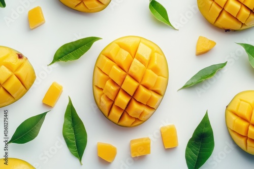 Overhead shot featuring sliced mangoes and green leaves arranged on white