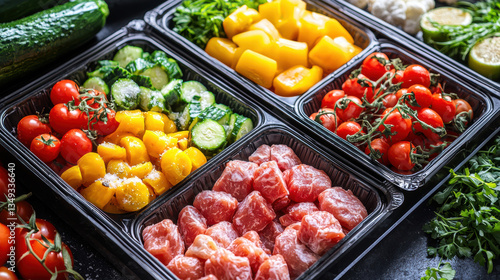 Overhead shot frozen food tray unboxed, vibrant vegetables and proteins, ready for heating, time-saving meal concept