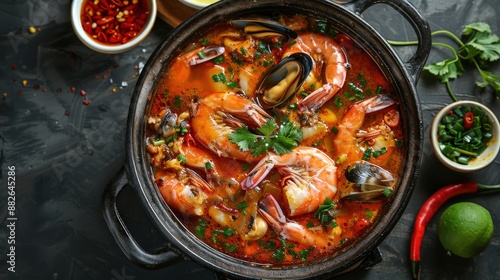 Overhead shot of a pot of Tom Yum Goong with a variety of seafood including shrimp, squid, and mussels, simmering in a fragrant broth infused with lemongrass, lime leaves, and Thai bird's eye chili