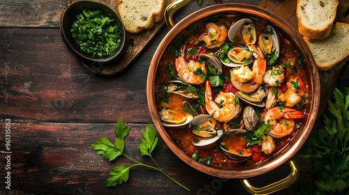 Overhead shot of a traditional Portuguese seafood cataplana, featuring clams, shrimp, and fish in a tomato-based broth, served in a copper pot with fresh herbs and crusty bread