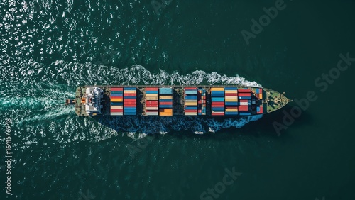 Overhead shot of a vessel carrying cargo containers, moving through green waters for shipping and trade purposes.