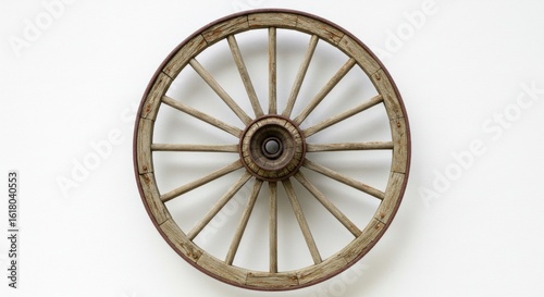 Overhead shot of a weathered, wooden wagon wheel against a stark white background, showcasing its spokes, hub, and rim