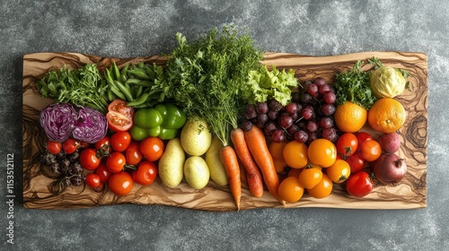 Overhead Shot of Handcrafted Wooden Board Displaying a Variety of Fresh Vegetables and Fruits