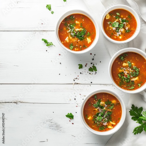 Overhead shot of Sopa a La Minuta in bowls, white wood.
