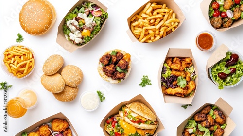 Overhead shot of various fast food items arranged on a white background including burgers, fries, chicken nuggets, and salads in cardboard